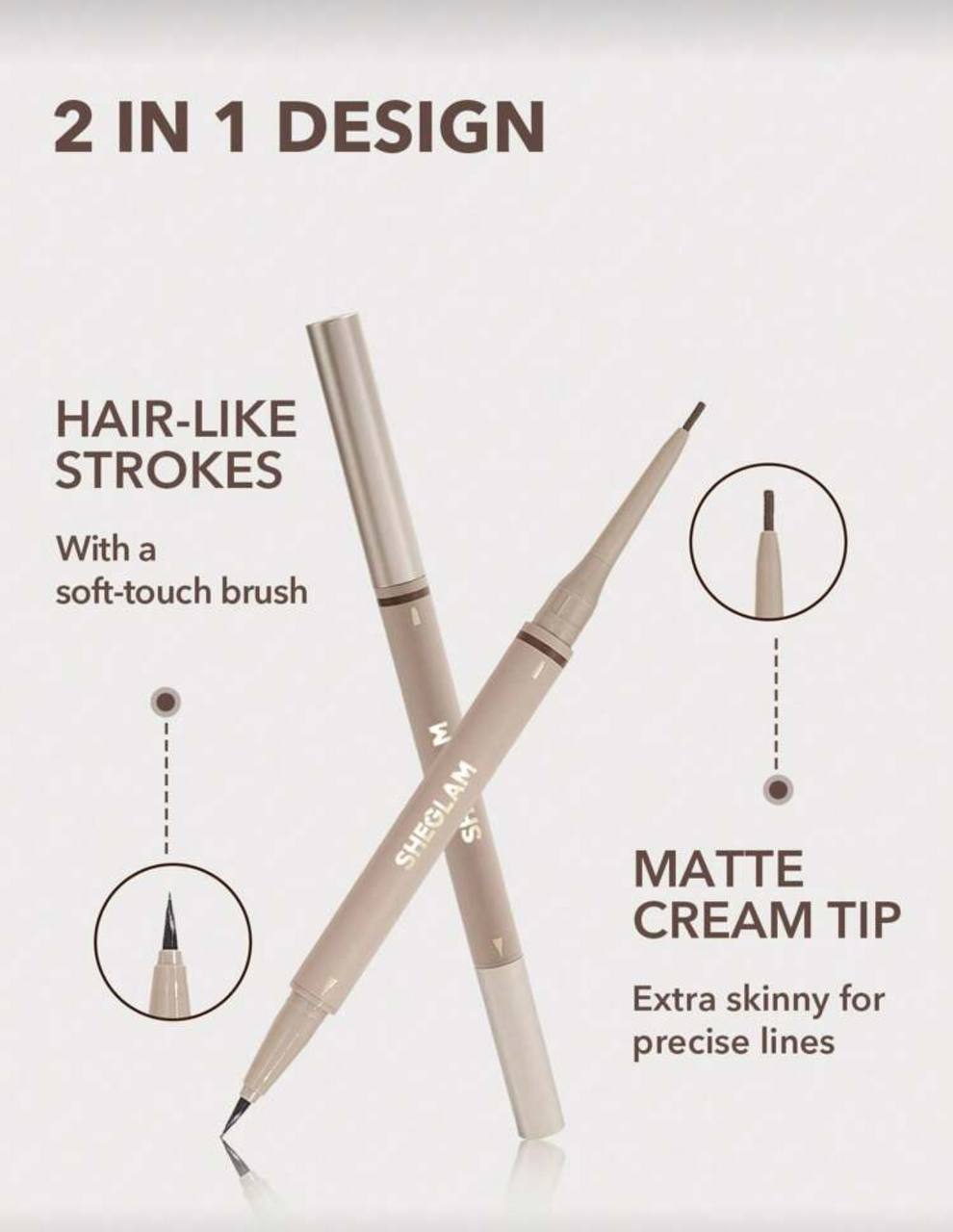 مداد و ماژیک ابرو SHEGLAM Dual-Ended Eyebrow Pencil & Ink Pen یکی از محبوبترین ابزارهای آرایشی برای طراحی و فرمدهی طبیعی ابروهاست. این محصول با دو سر کاربردی، امکان کشیدن خطوط نازک شبیه تار ابرو و پر کردن فضاهای خالی ابرو را بهصورت یکدست فراهم میکند.