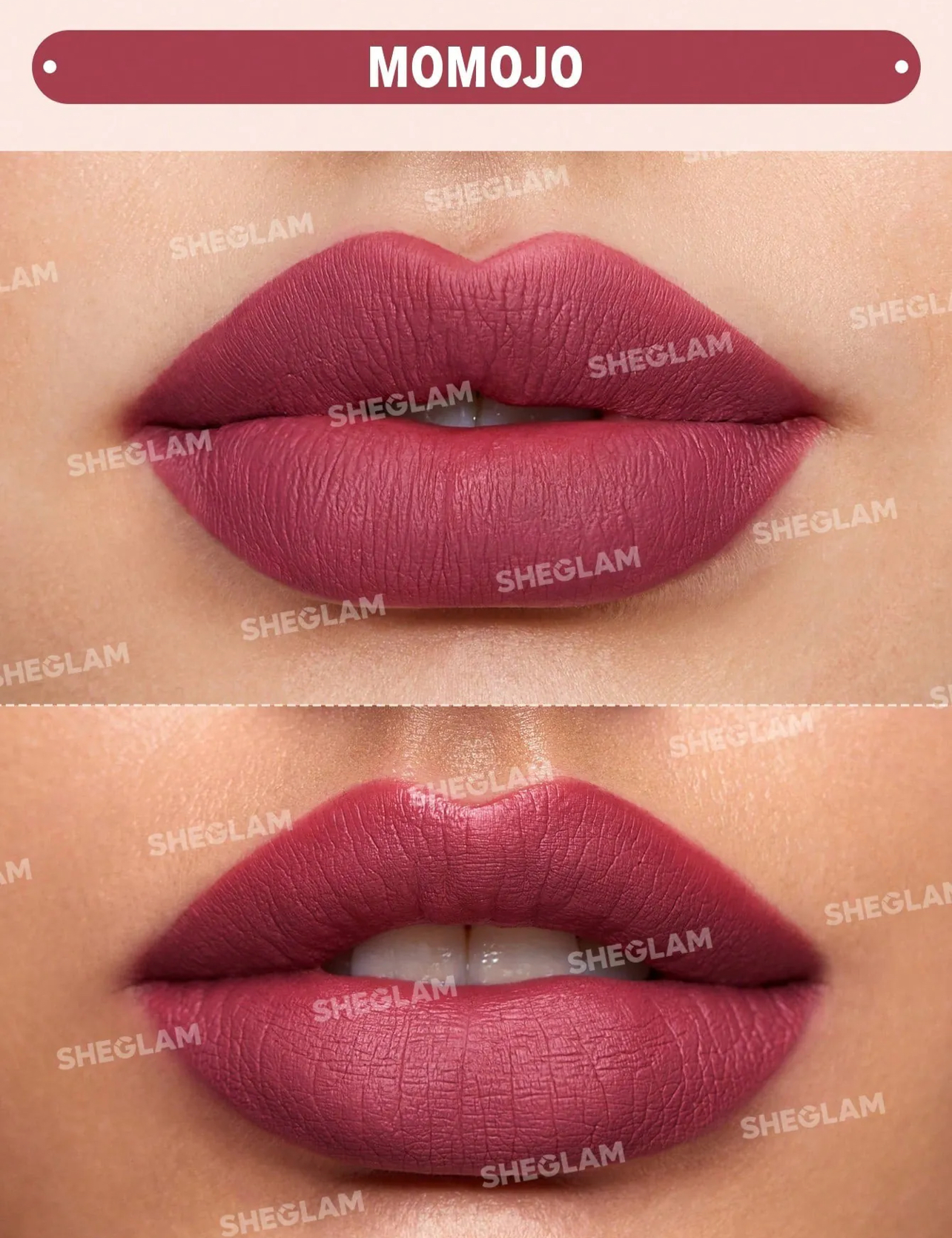 رژلب مایع مات شیگلم رنگ Momojo با بافت سبک، ماندگاری بالا و پوشش مخملی؛ مناسب آرایش روزانه و مجلسی.