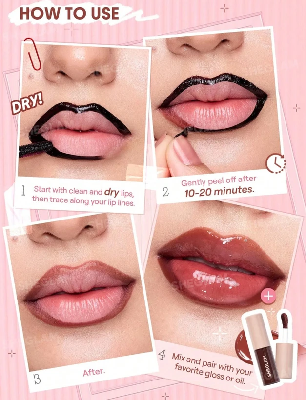 خط لب Peel Off رنگ Brownie Points از برند SHEGLAM یک محصول نوآورانه با تکنولوژی پیلآف است که پس از خشک شدن، لایه آن جدا شده و رنگی طبیعی، یکدست و ماندگار روی لب باقی میگذارد.